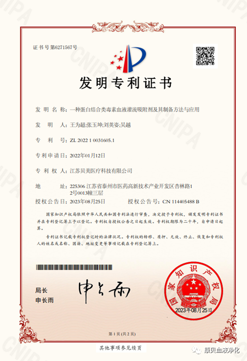 近日,康貝醫療下屬子公司江蘇貝美醫療科技有限公司開發申報的“一種蛋白結合類毒素血液灌流吸附劑及其制備方法與應用”發明專利,正式獲得國家知識產權局授權。
