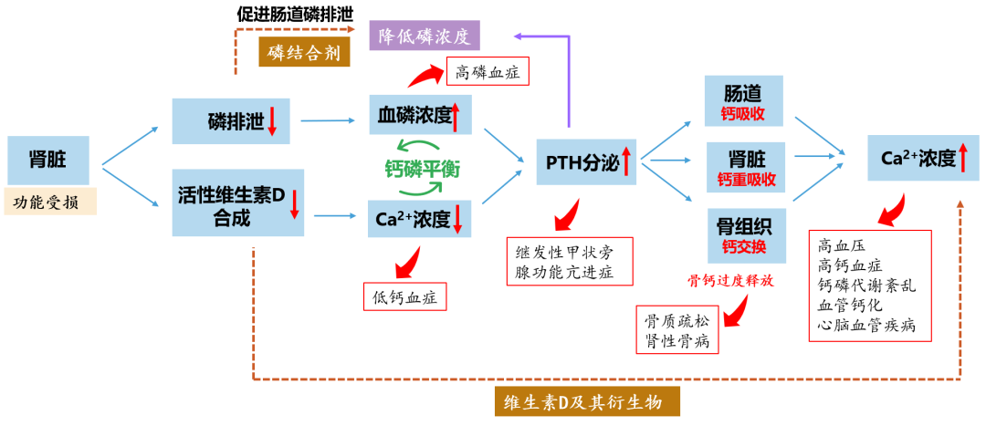 當腎臟受損,合成活性維生素D受阻,為維持鈣磷平衡,甲狀旁腺會分泌更多甲狀旁腺激素。甲狀旁腺激素通過增加骨組織鈣的釋放、腎內(nèi)鈣的重吸收和磷的排泄,促進血鈣濃度升高、血磷濃度降低。長期過度刺激甲狀旁腺會引起這種代償調(diào)節(jié)逐漸失效,導致鈣、磷、甲狀旁腺激素水平失控,形成惡性循環(huán)。[1-2]